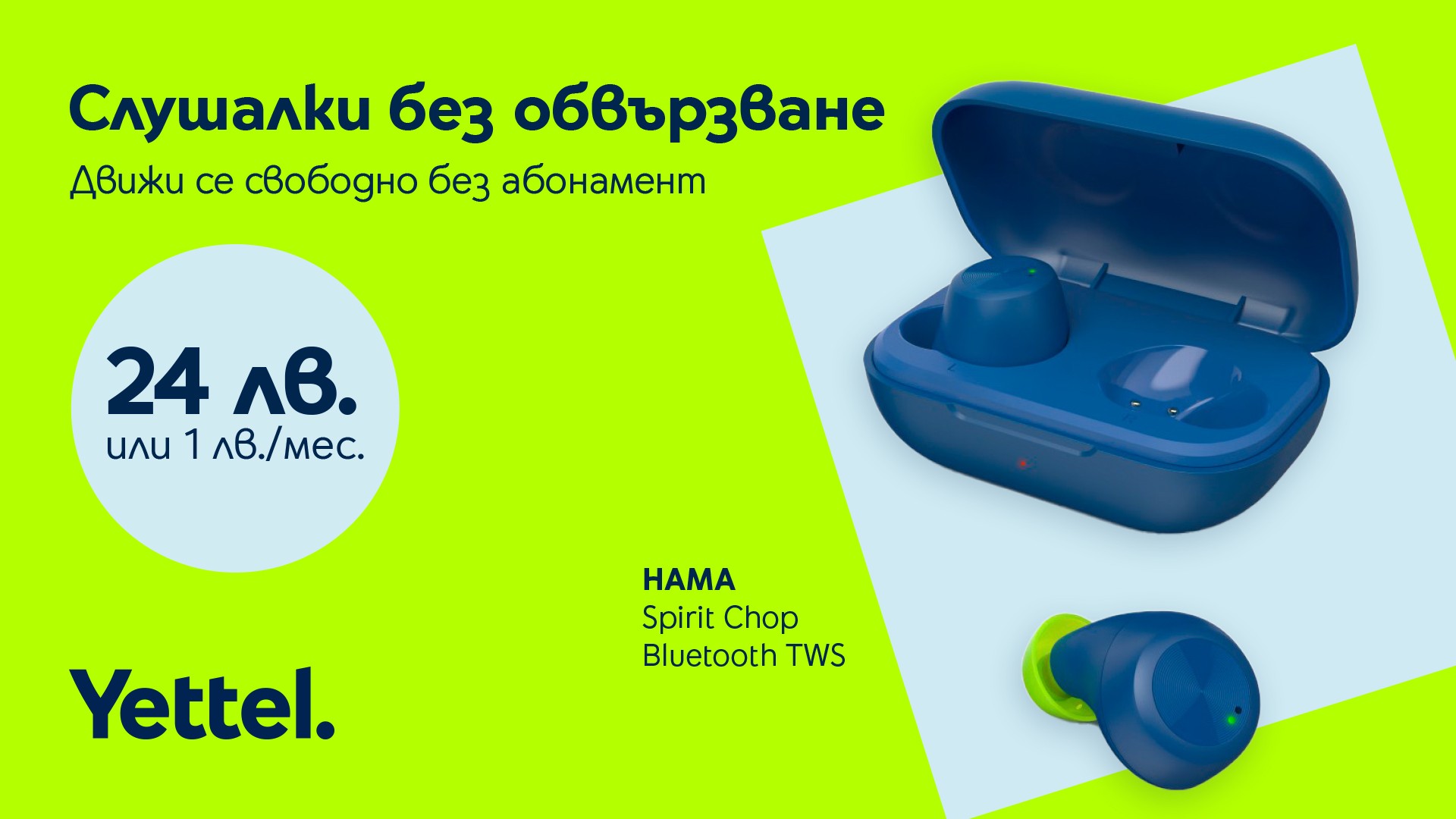 Yettel предлага на символични цени от 1 лв. на месец два вида слушалки HAMA в своята търговска мрежа, като част от кампанията си „Смело напред“. С тях можете да се движите свободно, докато слушате музика, любимия си подкаст или аудио книга.