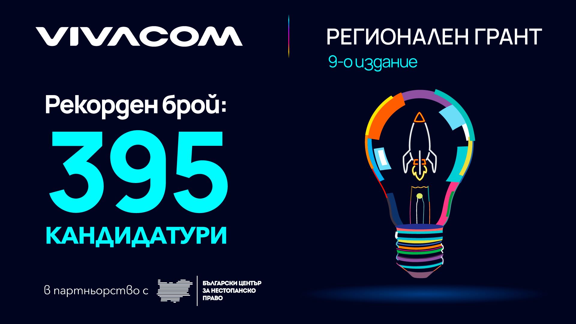 Рекордните 395 кандидатури на граждански организации получи деветото издание на Vivacom Регионален грант. В изцяло обновеното издание телекомът удвои размера на грантовете, увеличи общия фонд на 100 000 лв. и опрости процеса за кандидатстване. Тези новости, заедно с въвеждането на акселераторска програма за финалистите, дадоха възможност на още повече организации да кандидатстват за подкрепа на техните образователни и екологични идеи.
