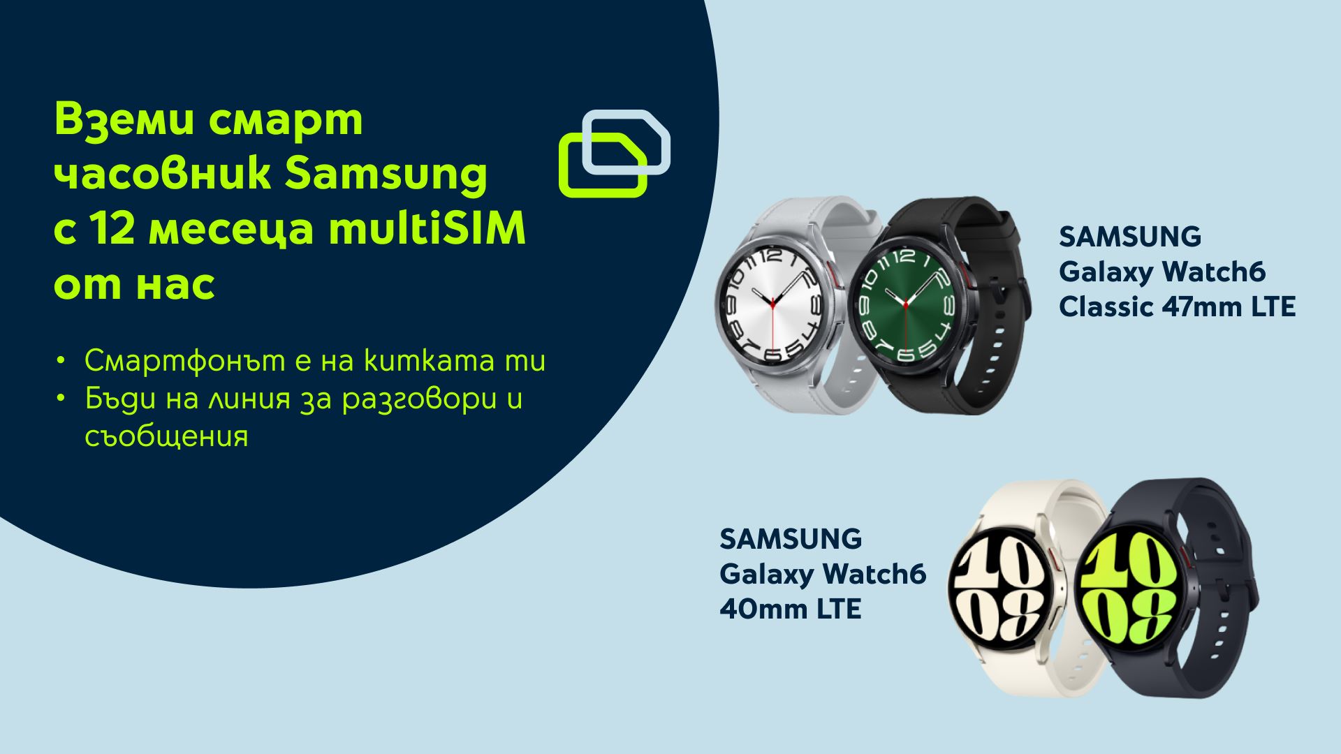 През март Yettel има предложение за любителите на смарт технологиите и активния начин на живот. До края на март потребителите, които закупят някой от LTE вариантите на Galaxy Watch6 (40mm и 44mm), Galaxy Watch6 Classic (43mm и 47mm), Galaxy Watch5 44mm и Galaxy Watch5 Pro 45mm, ще могат да активират без допълнително заплащане multiSIM за период от 12 месеца.