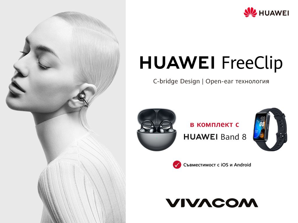 Потребителите на Vivacom вече могат да се сдобият с най-новите безжични слушалки на Huawei – FreeClip, в комплект със смарт гривна Huawei Band 8. Предложението е валидно до 21 април онлайн и в магазините на телекома на цена 12,98 лева на месец на лизинг за 24 месеца при сключване на 24-месечен договор за план Unlimited 100.