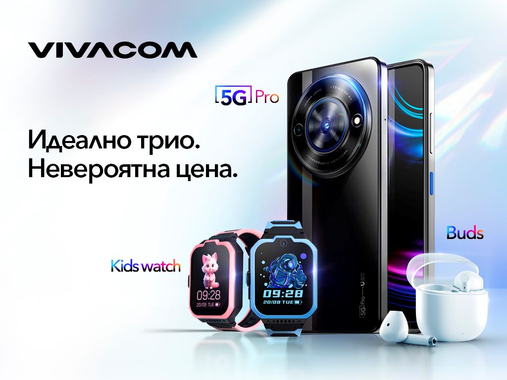 Vivacom издига портфолиото си от устройства на ново ниво, като прави иновациите още по-достъпни за всеки. В месеца, в който празнува своята 15-годишнина, телекомът представя три нови смарт продукта: Vivacom 5G Pro – следващо поколение смартфон, висококачествени безжични слушалки Vivacom Buds и умни детски часовници Vivacom Kids Watch, които се предлагат в розово и синьо.