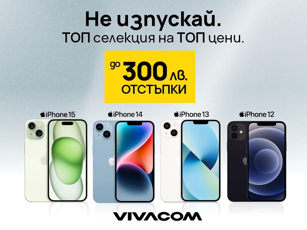 Vivacom изненада феновете на Apple със страхотна онлайн промоция с до 300 лева отстъпка. До 31 октомври всички любители на марката могат да се сдобият със страхотен iPhone от различни поколения – iPhone 12, iPhone 13, iPhone 14, iPhone 15, различни размери и памет, на специална цена в онлайн магазина. Смартфоните могат да бъдат закупени в брой или на лизинг с новите Unlimited планове на Vivacom, които имат най-голямата добавена стойност за клиентите досега.