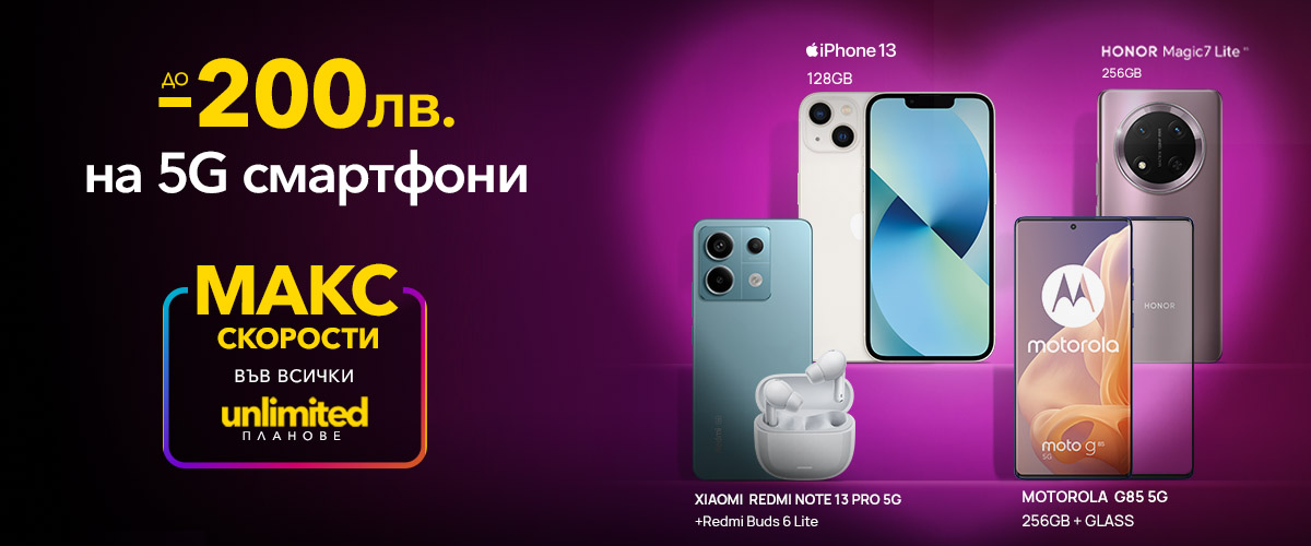 Сред вълнуващите 5G смартфони са iPhone 13 128GB, новият Honor Magic7 Lite 256GB, средният клас Motorola Moto G85 5G 256GB в комплект със стъклен протектор и флагманът Xiaomi Redmi Note 13 PRO 5G заедно с безжични слушалки Redmi Buds 6 Lite. Всички модели имат висока производителност, усъвършенствани камери и издръжливи батерии за нуждите на съвременните потребители.