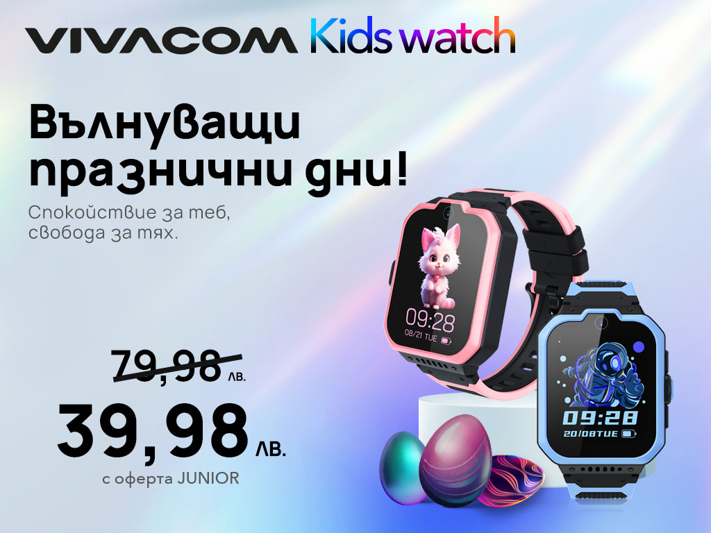През април Vivacom предлага специална пролетна оферта за детския часовник Vivacom Kids Watch. Родителите могат да зарадват своите деца с надеждно устройство на цена само 2.98 лв. на месец на лизинг за 24 месеца или 39.98 лв. еднократно с 24-месечен договор за оферта Junior.