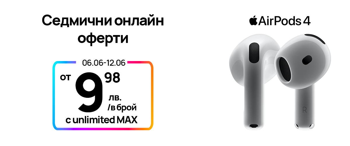 Специалната онлайн оферта за AirPods 4 на цена от 9.98 лева при еднократно плащане се предлага само на vivacom.bg до 12 юни включително.